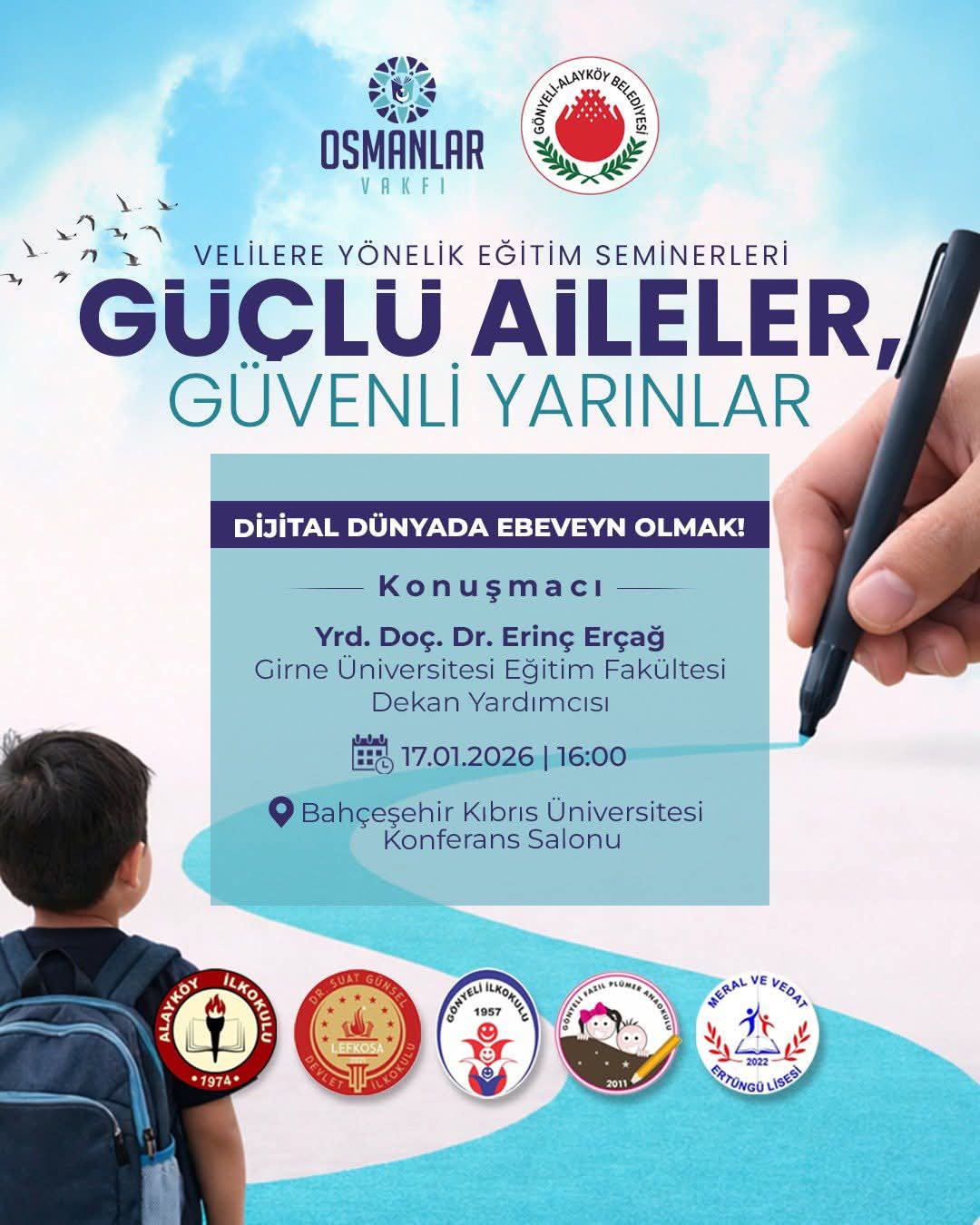 Osmanlar Vakfı ile Gönyeli–Alayköy Belediyesi iş birliğinde, bölge okullarının katkılarıyla hayata geçirilen “Güçlü Aileler, Güvenli Yarınlar” başlıklı velilere yönelik eğitim seminerleri başlıyor.