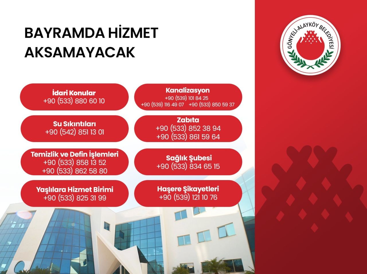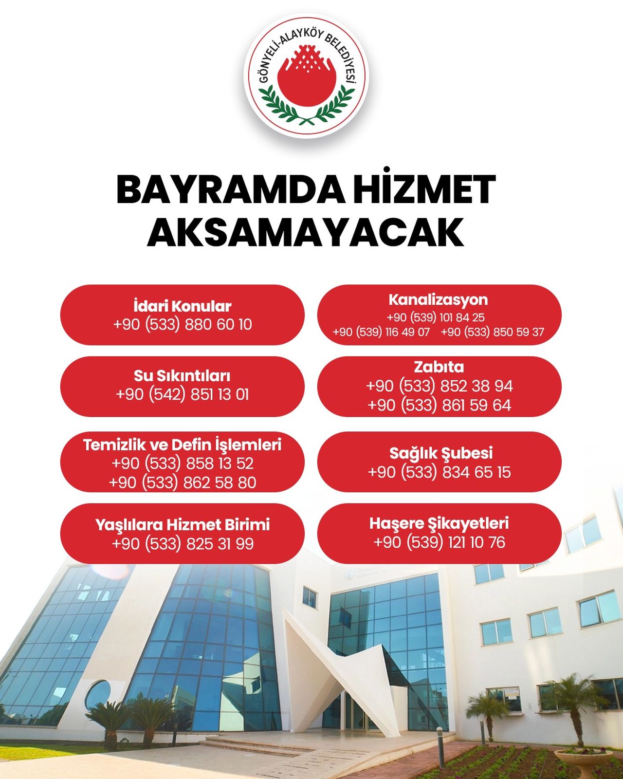 Amcaoğlu açıklamasında, “Vatandaşlarımızın huzurlu bir bayram geçirmesi için tüm ekiplerimizle görev başındayız. Gönyeli-Alayköy Belediyesi olarak 24 saat kesintisiz hizmet vermeye devam edeceğiz” dedi.