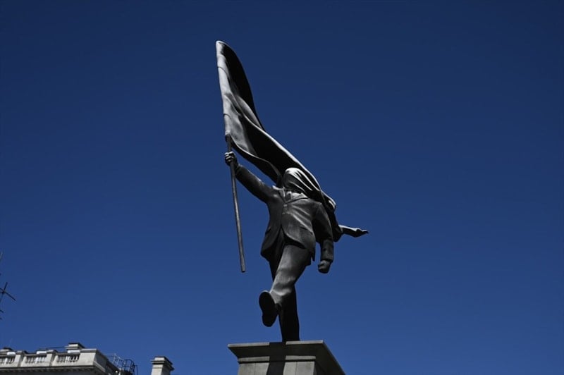 Yaklaşık 25 metre yüksekliğindeki heykel, kaide üzerinde ileriye doğru yürüyen takım elbiseli bir erkeği tasvir ediyor. Figürün elindeki bayrağın yüzünü örtmesi ise esere sembolik bir anlam yüklendiği yorumlarına neden oldu.