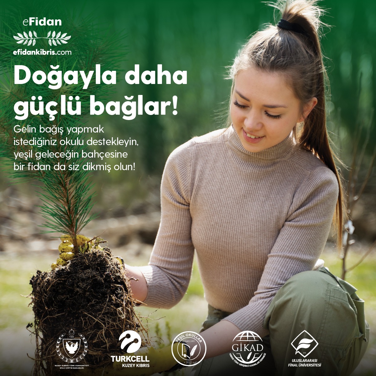 Uluslararası Final Üniversitesi (UFÜ) ve Kıbrıs Türk Girişimci Kadınlar Derneği’nin (GİKAD) başlattığı, Milli Eğitim Bakanlığı ve Kuzey Kıbrıs Turkcell’in destek verdiği Yeşil Okullar Projesi hayata geçti. Proje bu yıl, Kuzey Kıbrıs Turkcell’in efidankibris.com dijital fidan bağış platformu üzerinden gerçekleşiyor. Toplam 47 okulun katıldığı proje “Doğayla daha güçlü bağlar” sloganıyla düzenlendi. “Yeşil Okullar Projesi” için yapılan açıklamada okulların birbiriyle yarışacağı, okullar adına yapılacak her bağışın onları ‘Yeşil Okul’ olmak için üst sıralara taşıyacağı aktarıldı. efidankibris.com platformu üzerinden gerçekleşen projede en fazla fidan bağışı yapılan okulun ödüle layık görüleceği ifade edildi. Açıklamada, bu proje özelinde bağış yapılan fidanların Orman Dairesi’nin belirlediği bölgeye, proje sorumluları ve okullarla birlikte uygun tarihte dikileceği belirtildi.
