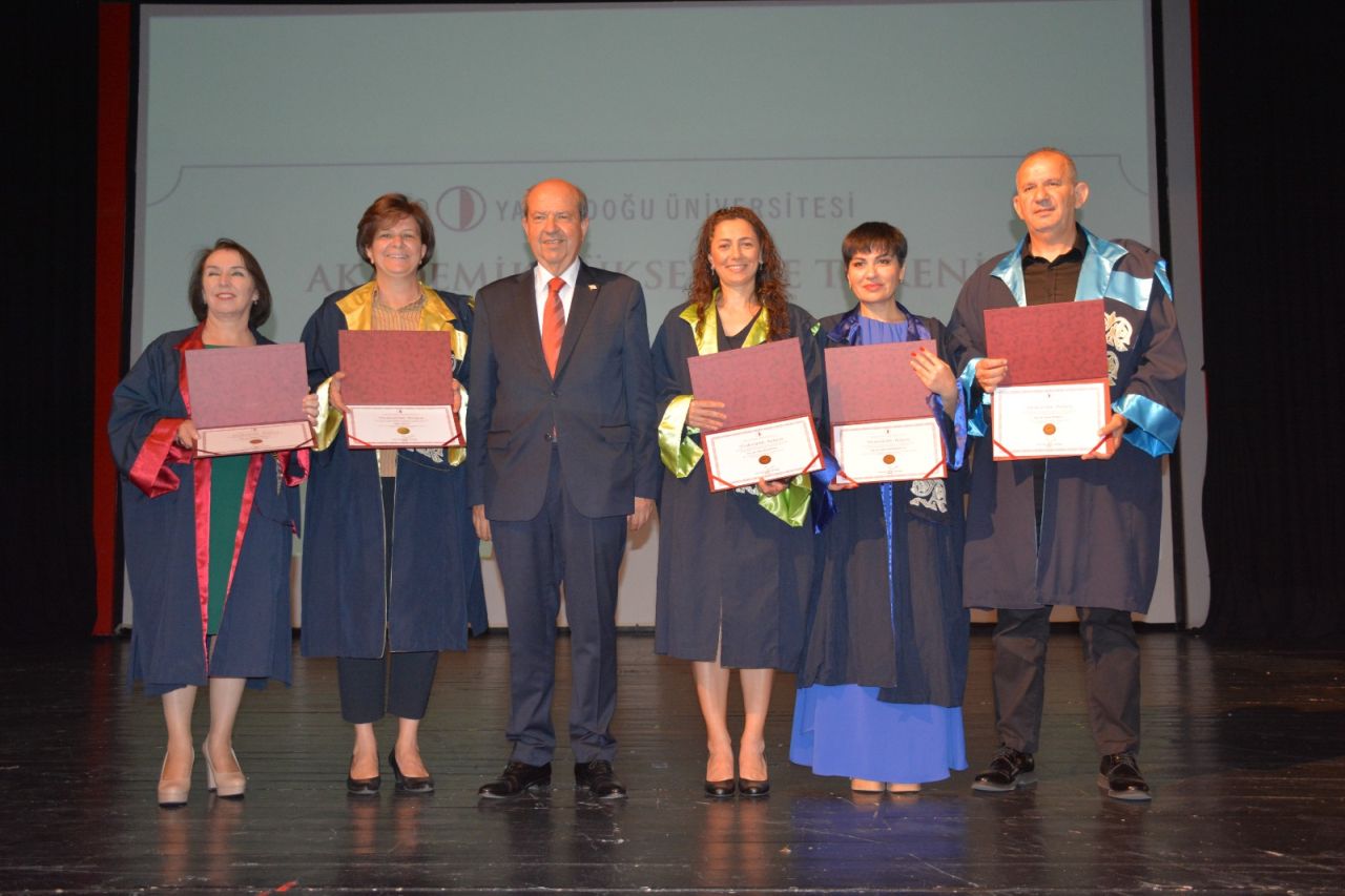 Cumhurbaşkanı Ersin Tatar’ın katılımı ile gerçekleştirilen Yakın Doğu Üniversitesi 2024-2025 Akademik Yılı Akademik Yükseltme Töreni’nde 64’ü yardımcı doçent, 24’ü doçent ve 19’u profesör olmak üzere 100’ün üzerinde akademisyen yeni unvanlarını aldı.