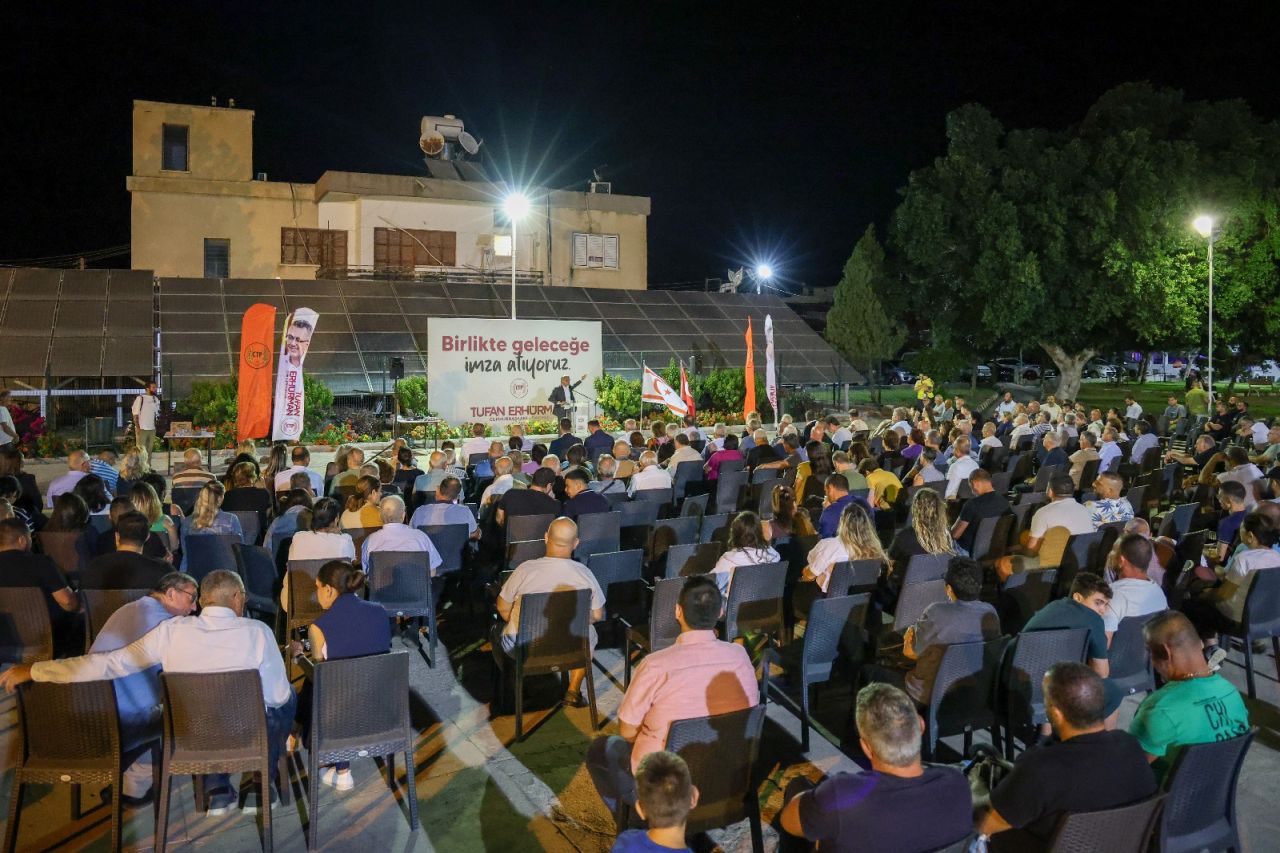 Yoğun katılımla gerçekleştirilen etkinlikte konuşan Cumhurbaşkanı adayı Tufan Erhürman, “Bu memlekette var olduğumuzu göstermek zorundayız” ifadelerini kullandı. Rum Lider Nikos Hristodulidis’e çağrıda bulunan Tufan Erhürman, “Hristodulidis hazır olsun, Kıbrıs Türk halkının çözüm iradesi masada olacak” dedi. “Taşınmaz Mal Komisyonu’nu kurduk kuralı, unuttuğumuz bazı davalar üstümüze gelmeye başladı” diyen Erhürman, beş senenin boşa geçtiğine dikkat çekti. Erhürman, “Devlet dediğiniz şey her şeyden önce ciddiyet ister. Söylediğiniz sözün arkasında durmayı ister. Hele de Cumhurbaşkanlığı makamındaysanız ciddi olmanız gerekir. Dünyanın hiçbir yerinde herhangi bir Cumhurbaşkanlığı seçiminde verilmeyen bir vaat veriyorum: Ciddiyete sahip bir Cumhurbaşkanlığı vaat ediyorum. Bunu vaat etmek zorunda kalıyorum; maalesef işler bu noktaya geldi” dedi. “Hiç kimse, hiçbir uluslararası kuruluş, bu adada çözüm iradesini defalarca ortaya koymuş bu halkın bu iradesini ve siyasi eşitliğini yok sayamayacak, görmezden gelemeyecek, bu halka çözümü istemeyen taraf muamelesi yapamayacak” diyen Erhürman, Kıbrıs Türk halkının, daha önce olduğu gibi bundan sonra da masadan kaçan taraf olmayacağını vurguladı. Tufan Erhürman, “Bu ülkenin, çocuklarımıza bırakırken son nefesimizde yüzlerine bakmaya utanacağımız bir yer haline getirilmesine asla izin vermeyeceğiz” diye ekledi.