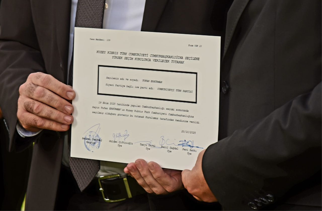 Kuzey Kıbrıs Türk Cumhuriyeti’nin (KKTC) 6’ncı Cumhurbaşkanı seçilen Tufan Erhürman, Cumhurbaşkanlığı’na seçildiğine dair mazbatasını bugün Yüksek Seçim Kurulu (YSK) Başkanı Bertan Özerdağ’dan aldı.